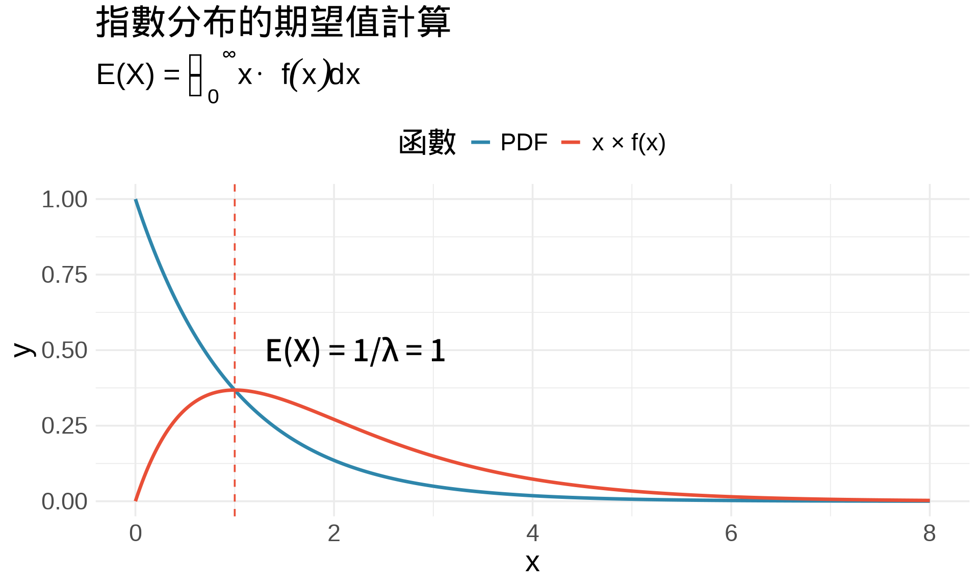 subtitle = expression("E(X) = " * integral(x %.% f(x)*dx, 0, infinity)),