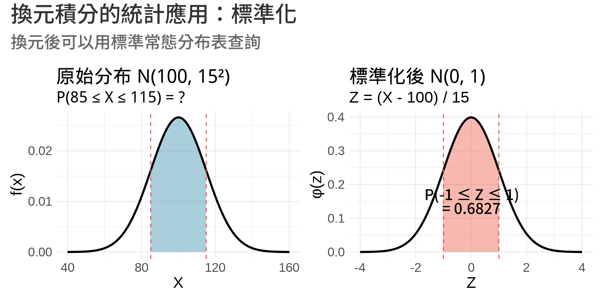 在上一章,我們理解了積分的**概念**:曲線下面積。但在實際統計應用中,我們需要**計算**這些面積: