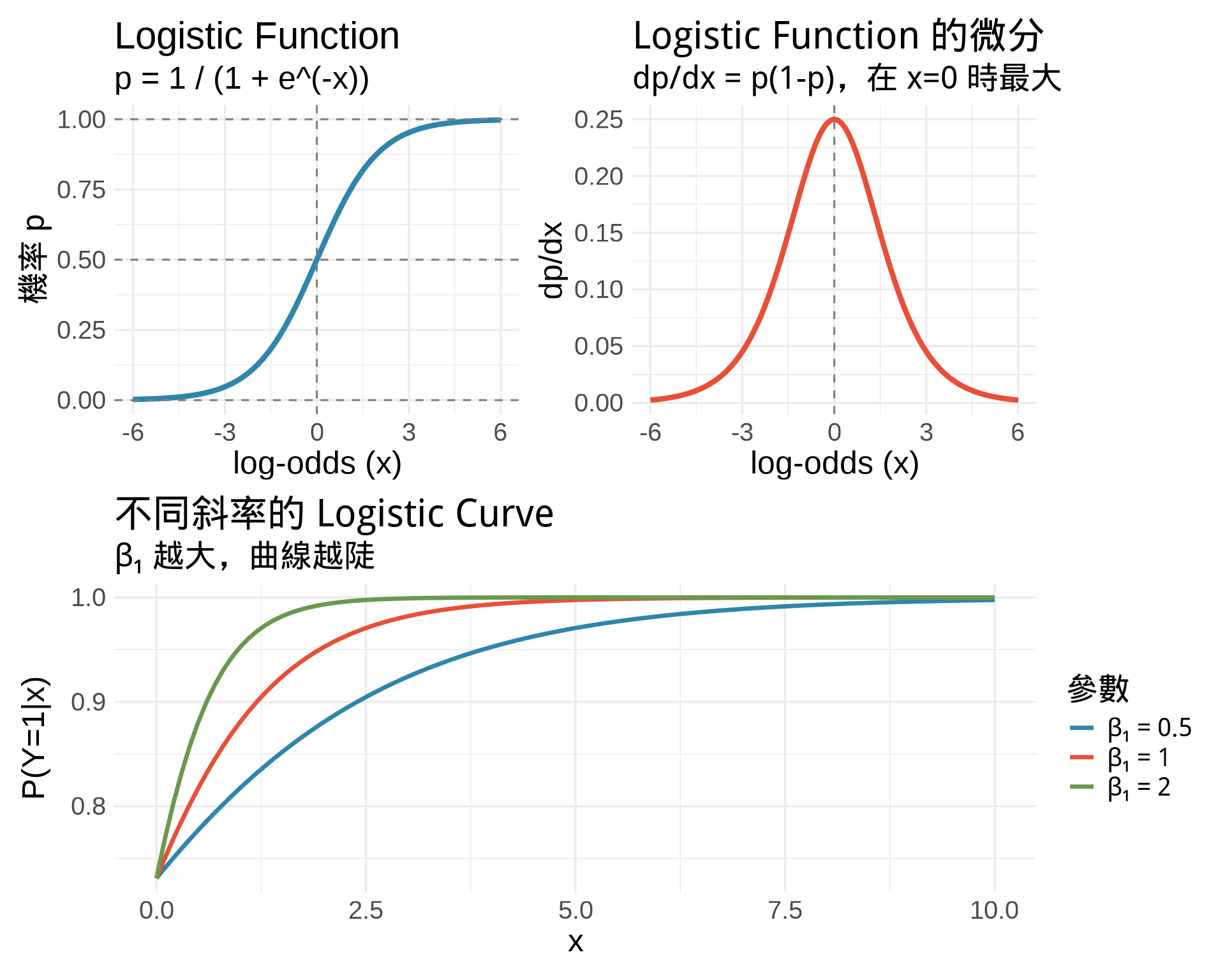 - **Odds Ratio**:$\exp(\beta_1)$ = x 增加 1 單位時的 odds 倍數