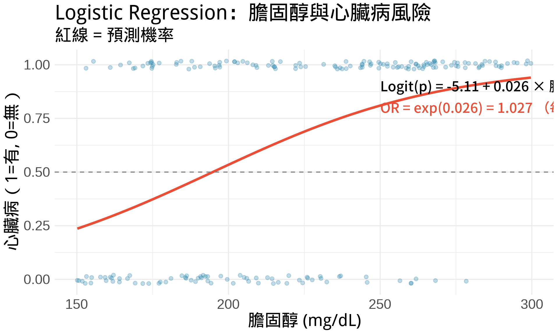 title = "Logistic Regression:膽固醇與心臟病風險",