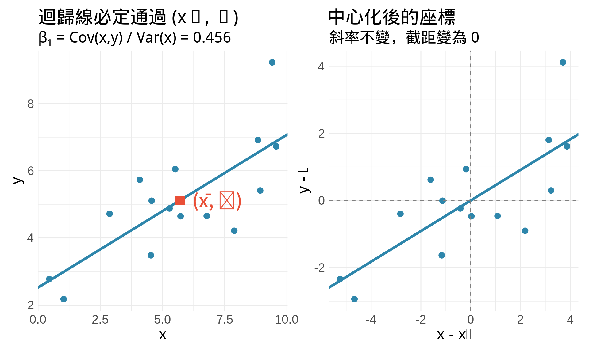 從數學推導可知 $\hat{\beta}_0 = \bar{y} - \hat{\beta}_1\bar{x}$。將 $(\bar{x}, \bar{y})$ 代入迴歸線方程式:$\hat{y} = \hat{\beta}_0 + \hat{\beta}_1\bar{x} = (\bar{y} - \hat{\beta}_1\bar{x}) + \hat{\beta}_1\bar{x} = \bar{y}$。這說明無論斜率為何,迴歸線必定通過資料的「中心點」$(\bar{x}, \bar{y})$。